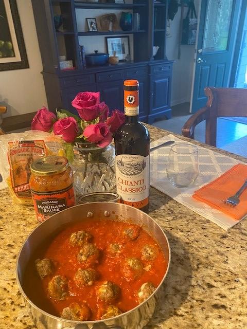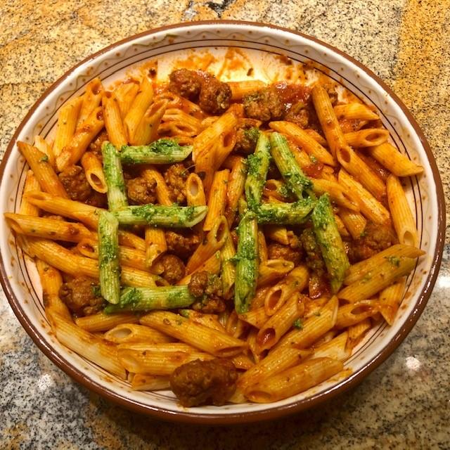 Margy Judd’s version (me) – grilled chicken sausage filled with feta and spinach and added them to the marinara sauce along with sauteed mushrooms and garlic, fresh basil and grated parmesan cheese. Added roasted broccolini with shallots as a side.