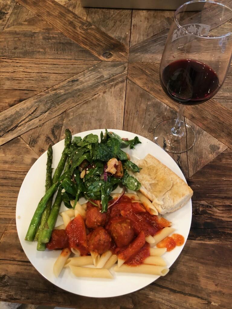 Kristen Joyce used the ingredients and added turkey meatballs, a spinach salad, asparagus and garlic bread. Gorgeous wood dining room table, I want it!