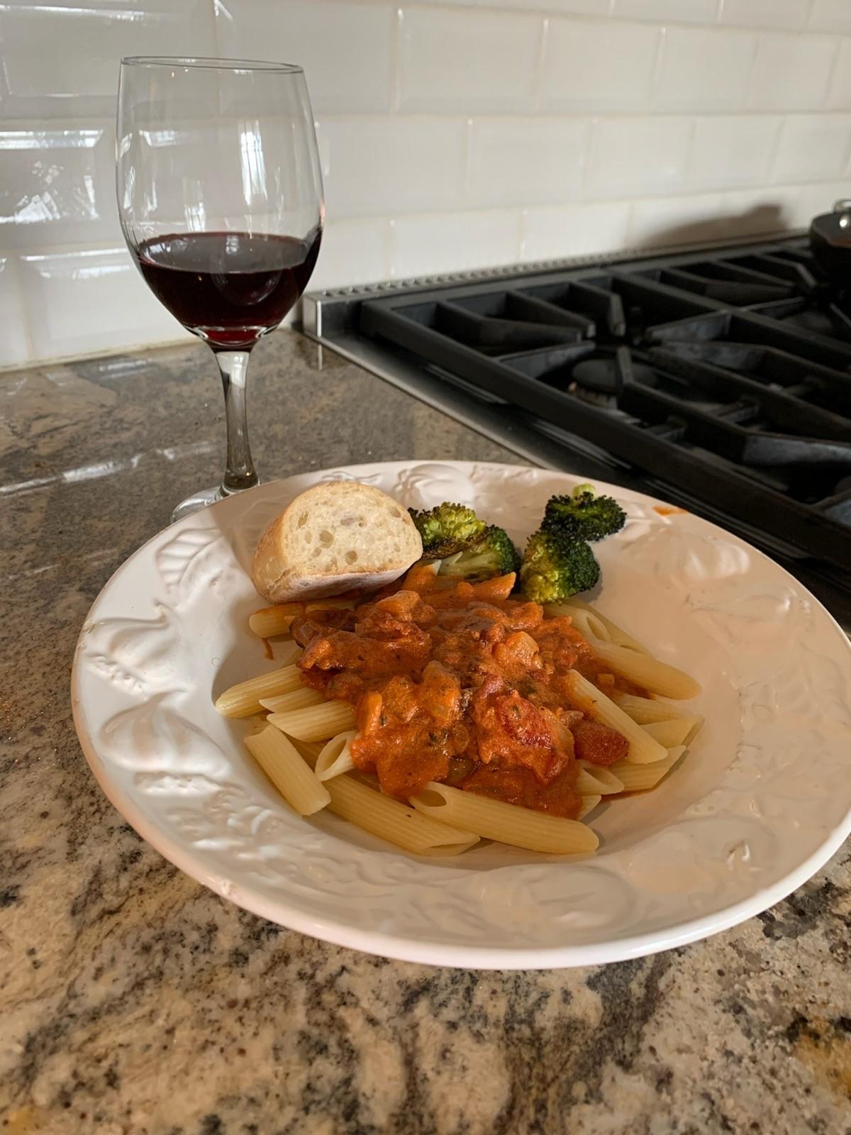 Laura Uhle made a penne ala vodka “because whose global pandemic pantry doesn’t include vodka and bacon”! AMEN