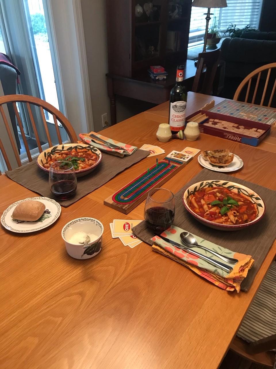 Lynne Brenner, used the mariana sauce to create the base for minestrone soup. Her hubbie enjoyed the penne pasta we supplied while she used glueten free noodles in her dish. They enjoyed dinner with games of cribbage and Scrabble.