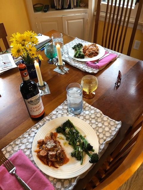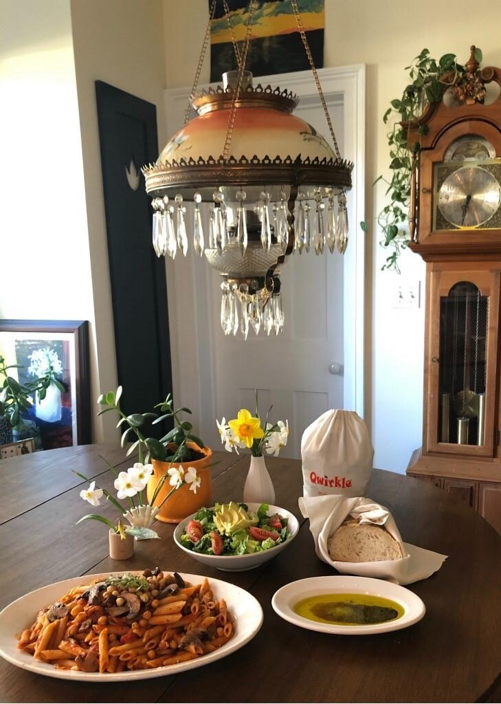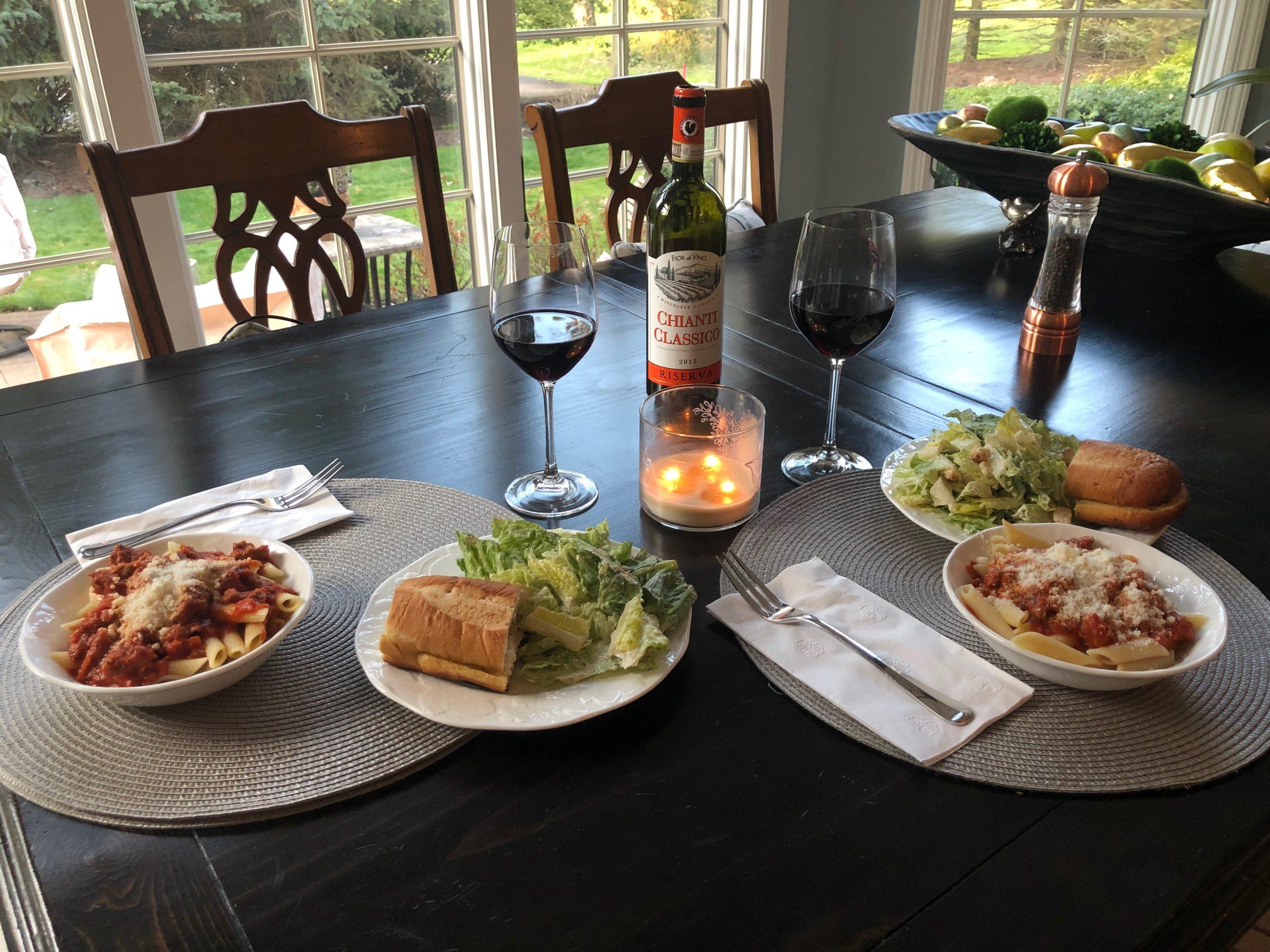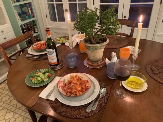 Caroline Weingart created a simple Bolagnese (Giada’s recipe) added ciabatta bread, olive oil and fresh parmasan cheese. “My kids favorite comfort food and who doesn’t need that right now? Now we are playing Settlers of Catan”. Beautiful tablescapes of my co-workers is inspiring me to make every meal feel special, it only takes a little effort!