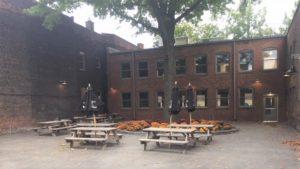 It’s fabulous to watch 600′ ore boats rumble up the river to Lake Erie as rowers glide silently next to them. There are lots of cool spaces (available for rental), including this courtyard with a 100 year old tree that anchors the campus and is a favorite good weather spot for students to take the rowing machines outside to practice.