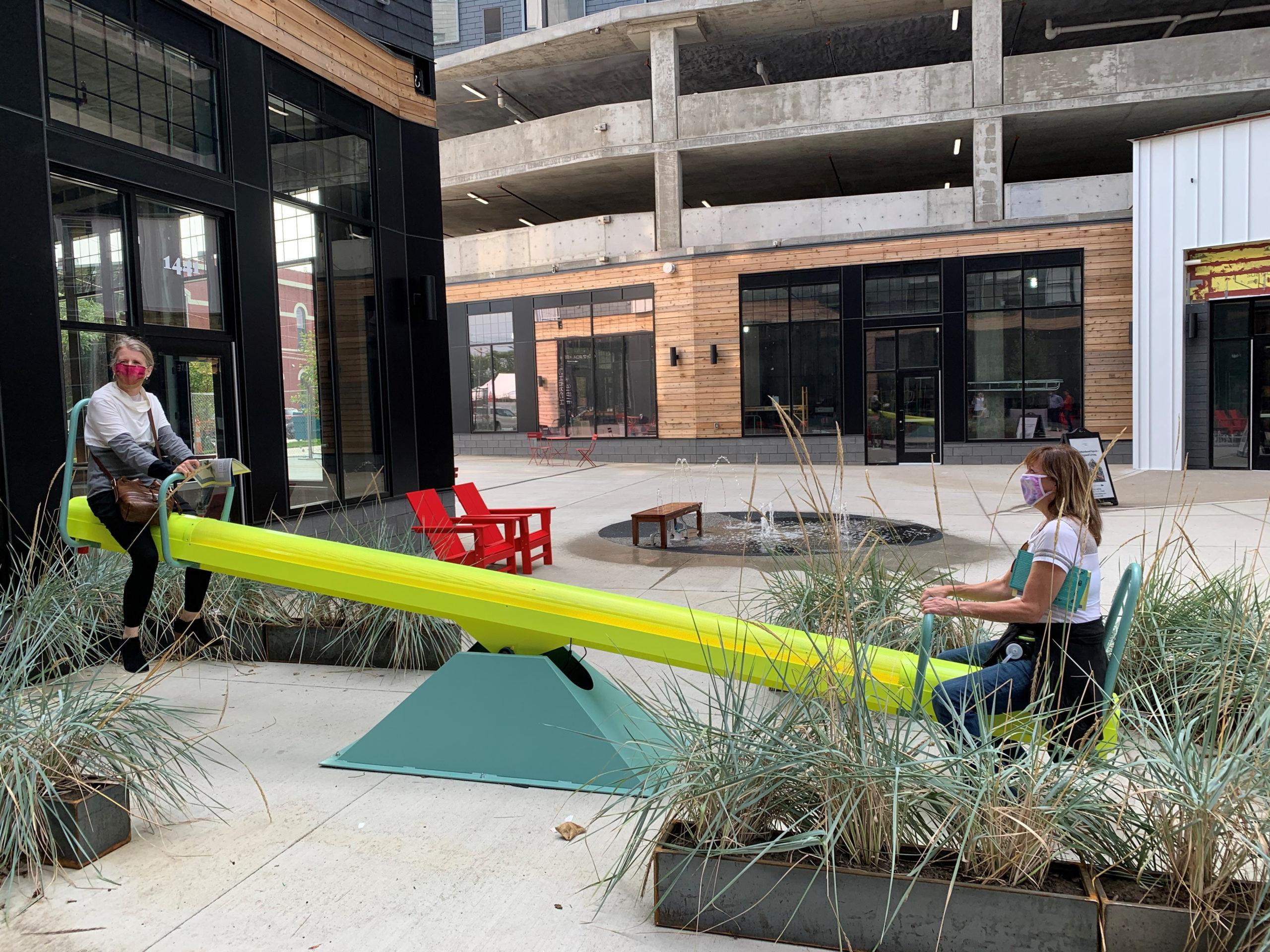 The outdoor space between the two buildings is a beautifully designed mini-park, complete with a splash pool, see-saw, tiered seating perfect for listening to live music or enjoying a picnic lunch. A rock climbing wall is being designed by Chick Holtkamp, a climber for decades who created Climb Cleveland rock gym in his Tremont neighborhood expanding the sport to Hingetown. This is not a gated park exclusive to the residents, rather the openness invites those passing by to join in.