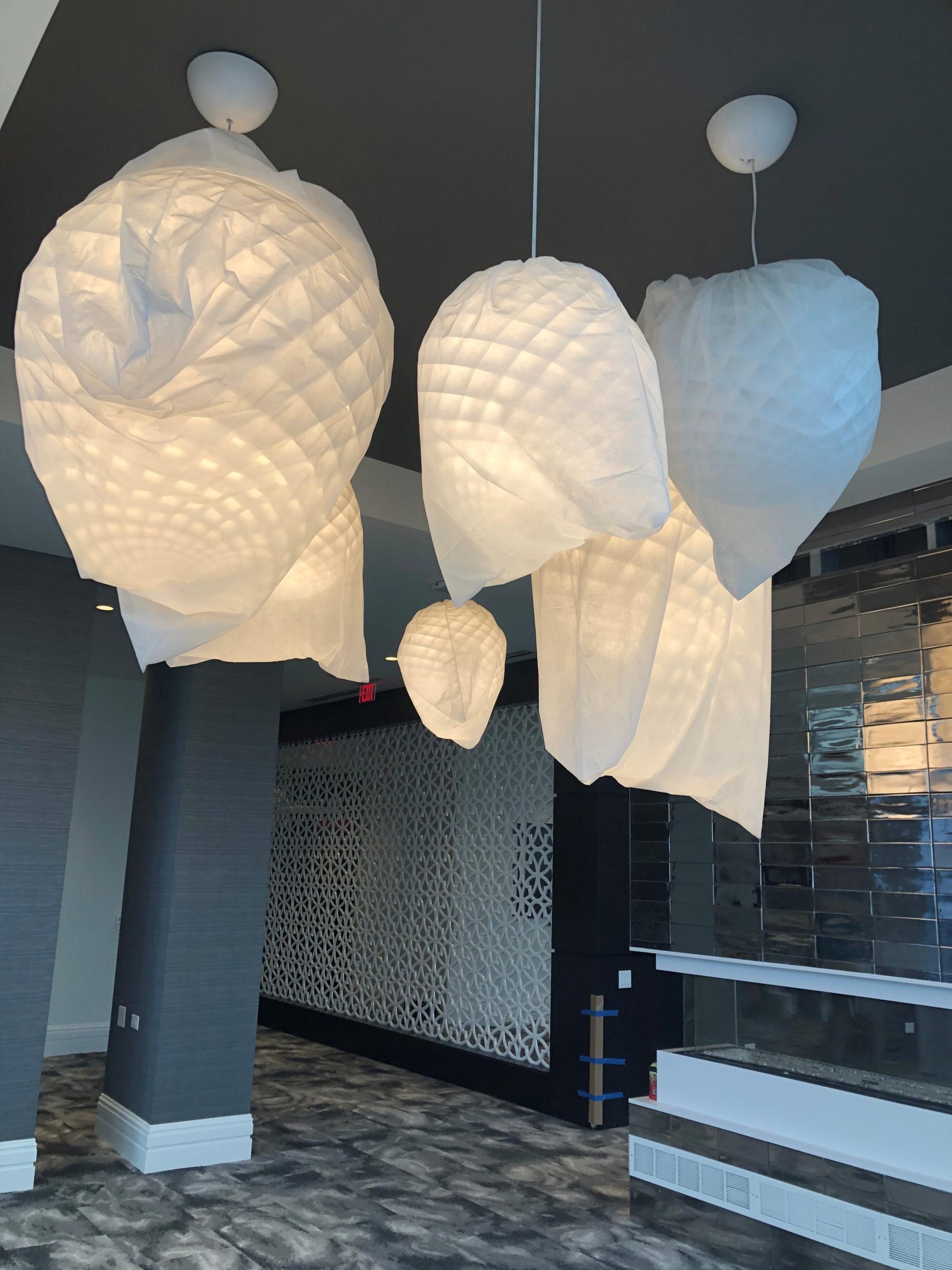 This sophisticated building has many details inspired by the architecture and drama in the theaters like these cool ceiling fixtures