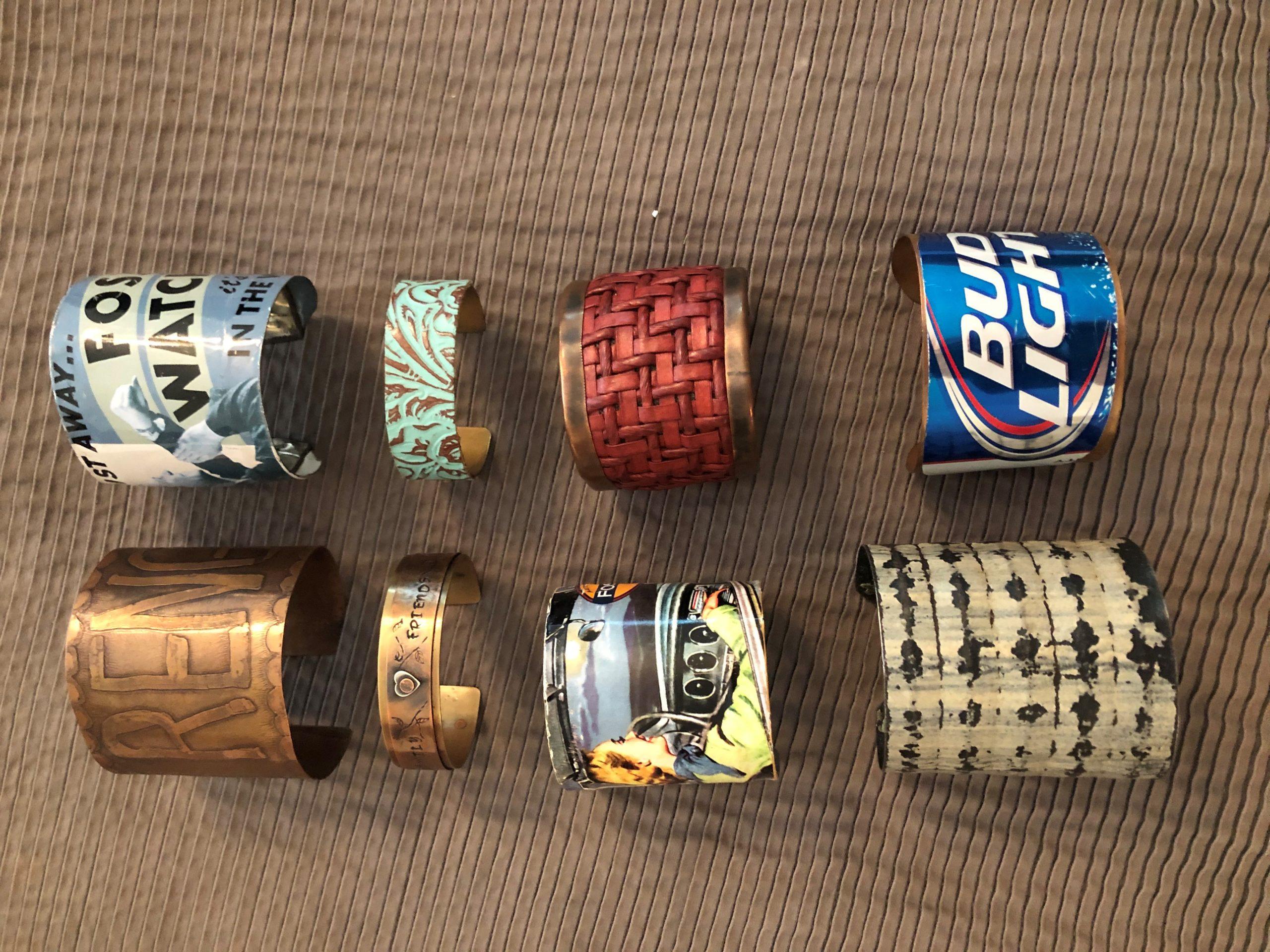We wanted to share her inspiring story. Full disclosure, I own a few Sandy pieces myself and am particularly addicted to her one-of-a-kind cuffs which are made of things that were headed to the landfill and have been reimagined as art for your arm! My collection so far looks like this: